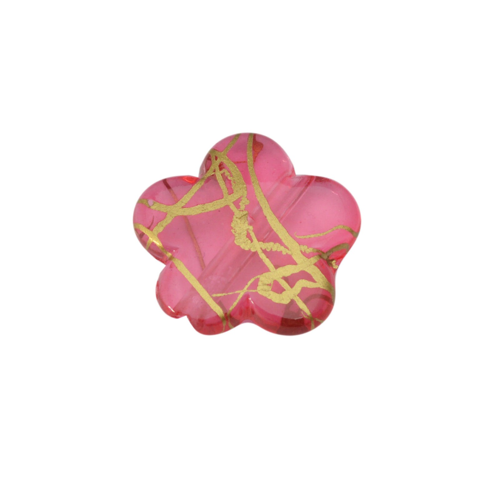 Donkerroze bloemvormige kunststof kraal met goudkleurige tekens (14 x 15 mm)