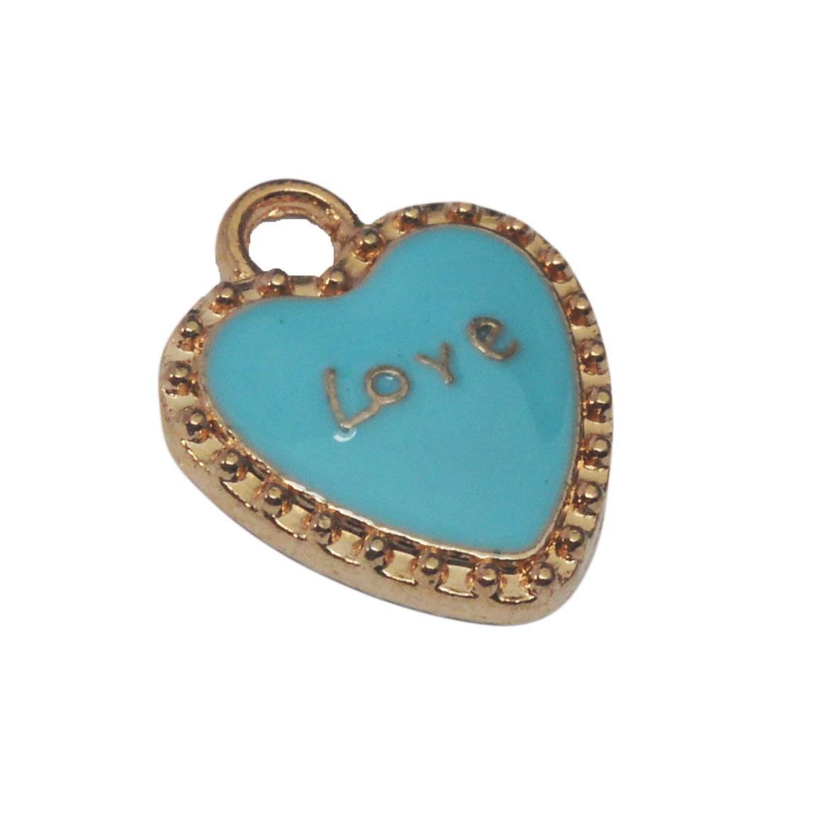 Goudkleurige/blauwe bedel – hart & love (13 x 16 mm)