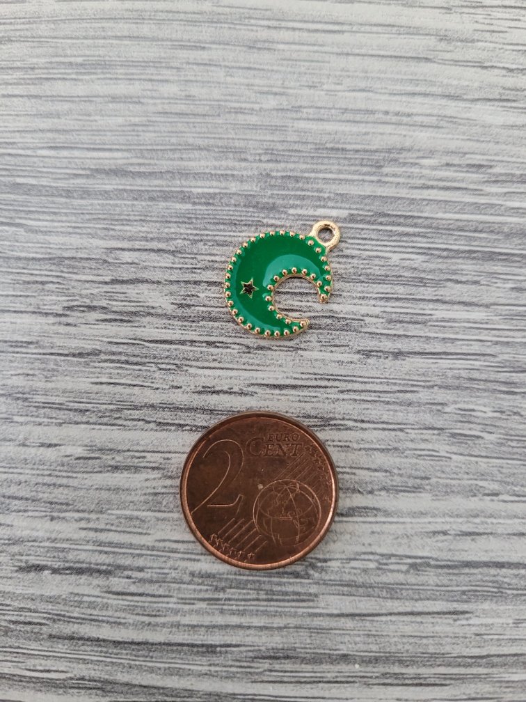 Goudkleurige/groene bedel – maan & ster (13 x 17 mm)