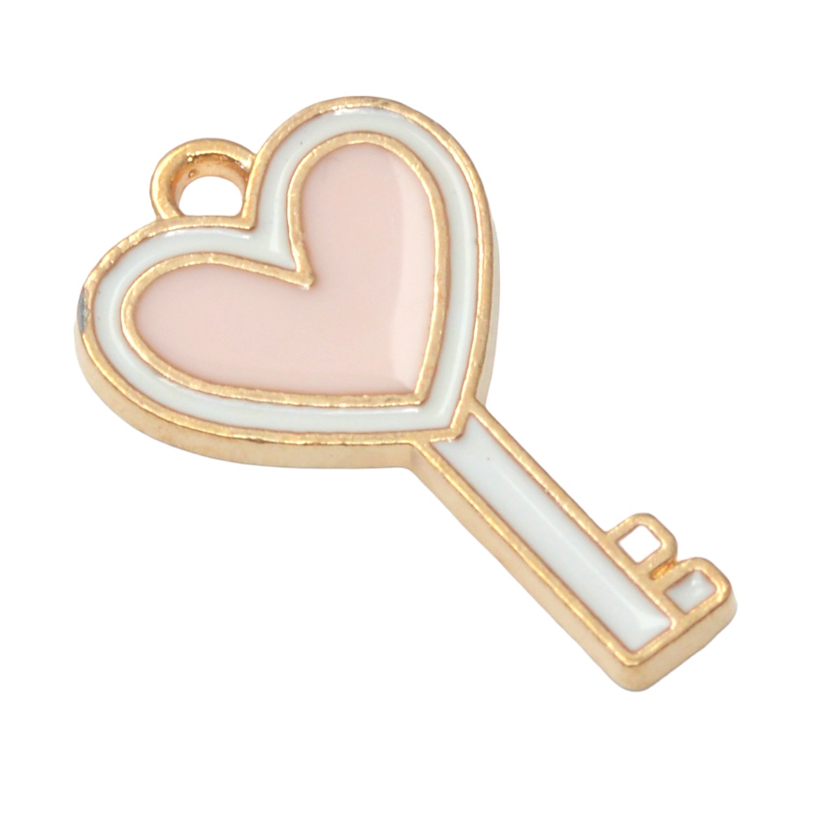 Goudkleurige/witte/roze bedel – sleutel & hart (13 x 23 mm)