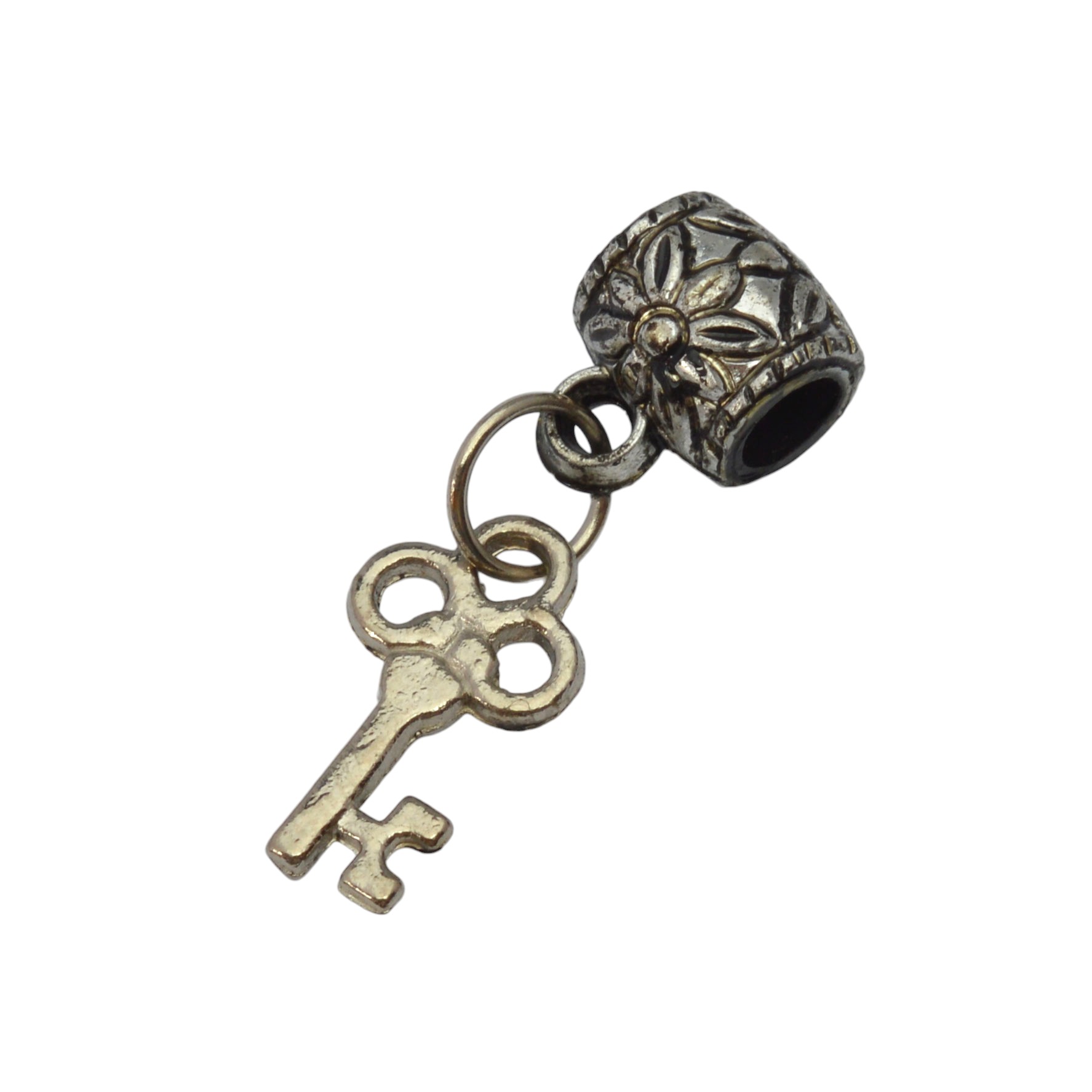 Zilverkleurige ronde bedel kunststof met sleutel bedel (8 x 28 mm)