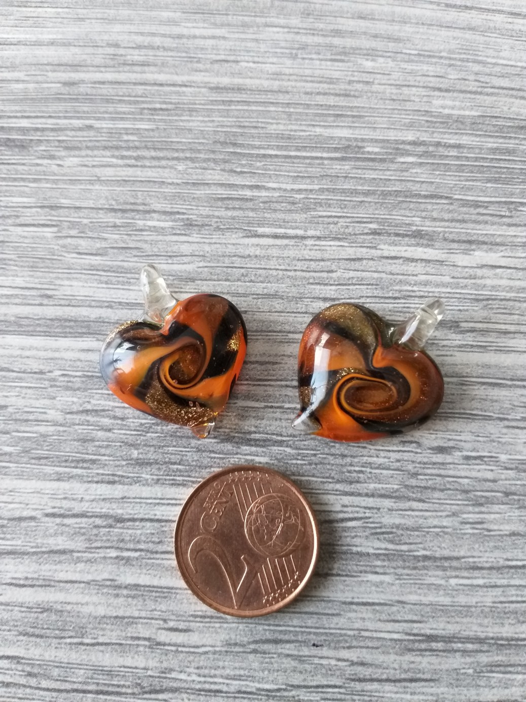 Oranje, zwarte en goudkleurige hartvormige Venetiaanse glaskraal (21 x 26 mm)